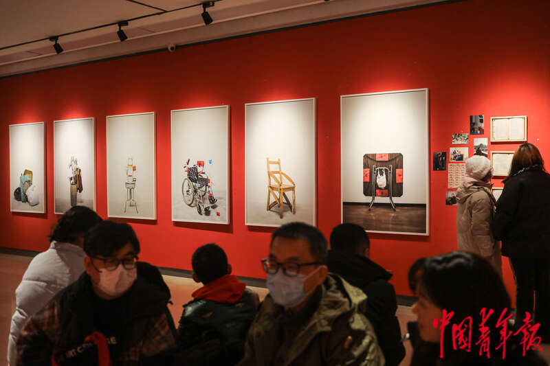 12月9日,辽宁沈阳,鲁迅美术学院美术馆,第11届学院优秀摄影作品展上,来自各个高校的学生们在展厅交谈,背后是西安美术学院学生张昊伟的作品。他为养老院的老人拍摄肖像,并改造了一些老人在日常生活中使用的物品,将其用纪念碑般的方式拍摄下来,试图以摄影为媒介探讨衰老和孤独的议题。中青报·中青网记者 孔斯琪/摄
