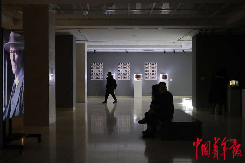 12月9日,辽宁沈阳,鲁迅美术学院美术馆,第11届学院优秀摄影作品展,参观者与AI仿制的奥本海默隔空“对话”。中青报·中青网记者 孔斯琪/摄