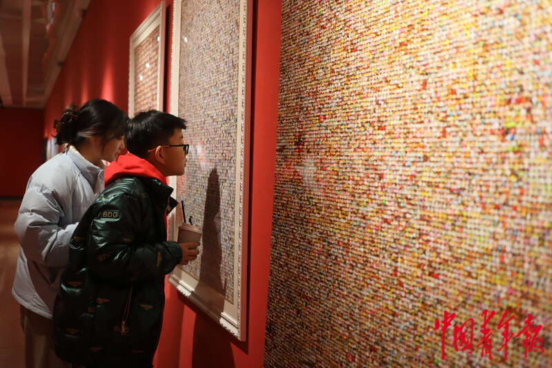 12月9日,辽宁沈阳,鲁迅美术学院美术馆,第11届学院优秀摄影作品展上,一名小观众与家人在广西师范大学学生赵梓旭的作品《消费的图像系列》前驻足。这件作品将互联网上的口红、香水等大量商品图像进行分类整理,再用电脑拼贴在一起,试图通过对广告宣传图像的“加工”,展现作者对当今时代特征的独特感受。中青报·中青网记者 孔斯琪/摄