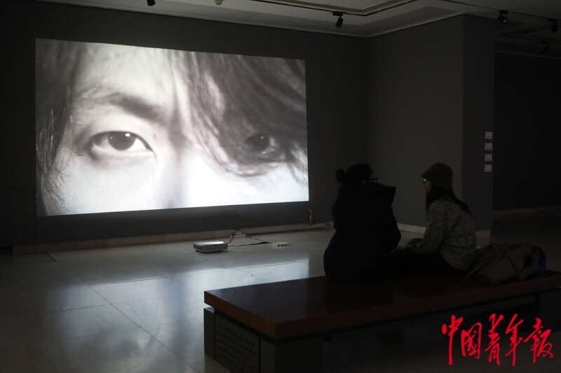 12月9日,辽宁沈阳,鲁迅美术学院美术馆,第11届学院优秀摄影作品展,两名学生观看实验影像《从一个面包开始》。中青报·中青网记者 孔斯琪/摄