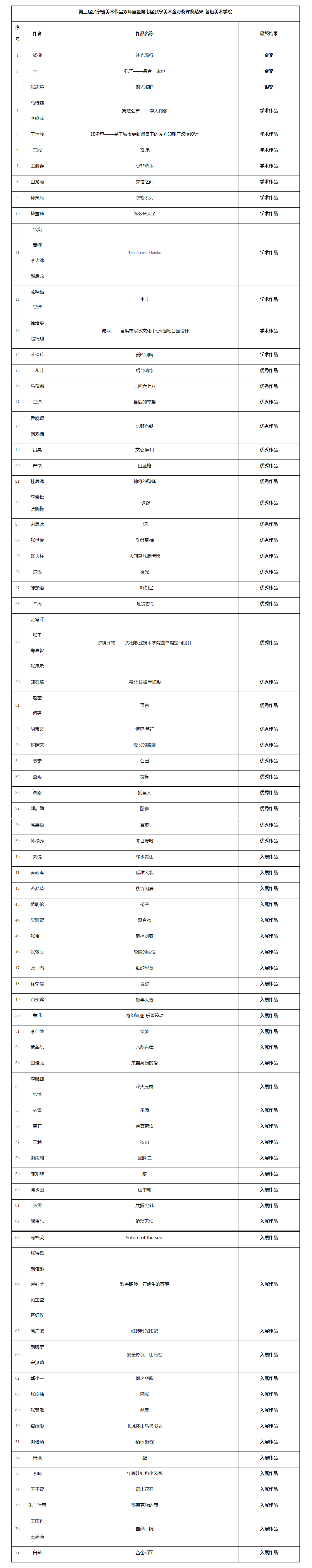 由辽宁省文学艺术界联合会、辽宁省美术家协会联合主办的第三届辽宁省美术作品双年展暨第七届辽宁美术金彩奖评奖活动于8月27日举行,我校师生在报名参展的318件作品中,有77件作品脱颖而出,成功获奖或入展。其中金奖作品2件、银奖作品1件、学术作品11件、优秀作品25件、入展作品38件。
