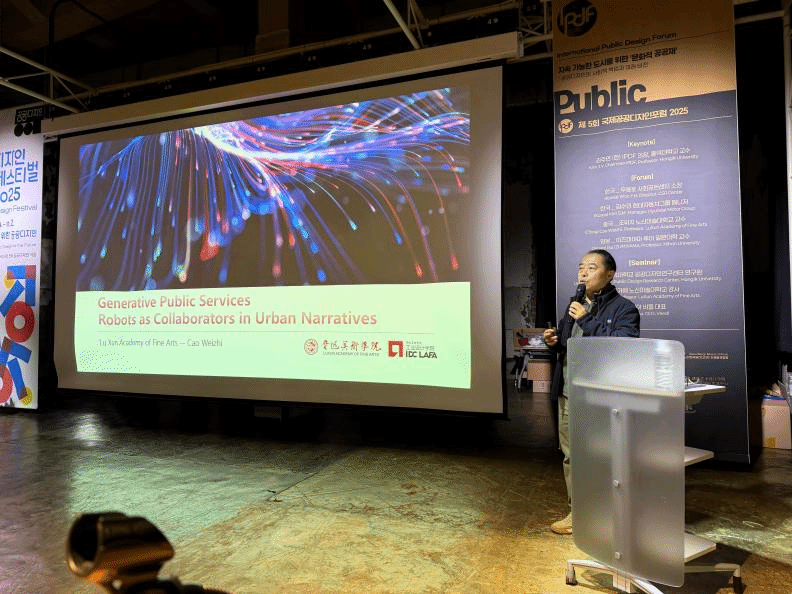 韩国弘益大学公共研究中心研究员金成勋发言,阐述人工智能与公共设计协作之间的相互促进作用,并提出既要感谢人工智能,也要思考人工智能,技术不应只是工具,更应该成为理解人性的桥梁。