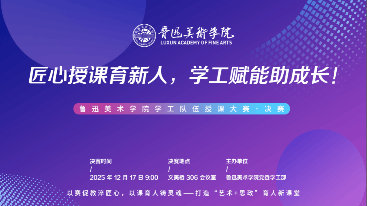 为进一步提升学工队伍授课能力与专业素养,打造业务精湛、能力突出的专业化学生工作队伍,充分发挥学工队伍在学生思政教育、学业指导、心理健康、就业创业等方面的指导作用。在学校党委的高度重视和正确领导下,鲁迅美术学院学工队伍授课大赛在师生的热切关注中圆满落幕。本次大赛以 “匠心授课育新人・学工赋能助成长”为主题,历经初赛、决赛两个阶段的激烈角逐,各类奖项尘埃落定,为校园育人工作注入新的活力。