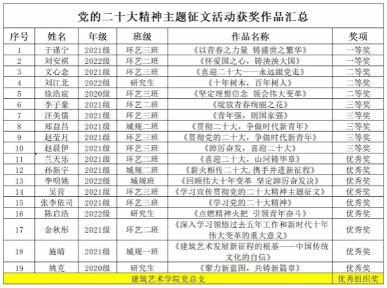经评审,建筑艺术设计学院学生获一等奖2篇、二等奖3篇、三等奖5篇、优秀奖9篇。在活动过程中,建筑艺术设计学院党总支组织工作突出,被授予优秀组织奖。