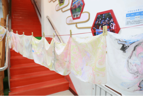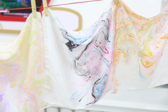 一幅幅水拓丝巾铺展开来,斑斓色彩随水波流动凝固,学生们创意在水拓丝巾上绽放。
