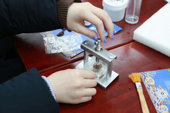 活动现场,非遗传承人手把手教学:每一颗合香珠经过志愿者和残障朋友细心打磨,散发出淡淡的药香气;点翠工艺的羽毛在他们的巧手下焕发光彩,蓝色的羽片在阳光下闪烁着独特的光泽。