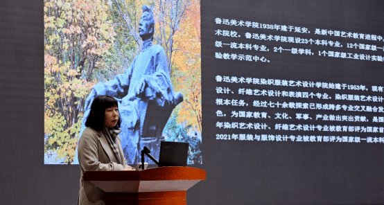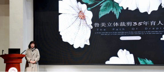 ▲我校染织服装艺术设计学院院长任绘以《鲁美立体裁剪35年育人之路》为题发表演讲