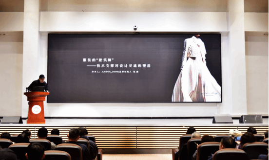 ▲中国最佳女装设计师、JUMPER ZHANG品牌创始人兼设计总监张鹏以《服装的“建筑师”——技术支撑对设计灵魂的塑造》为题发表演讲