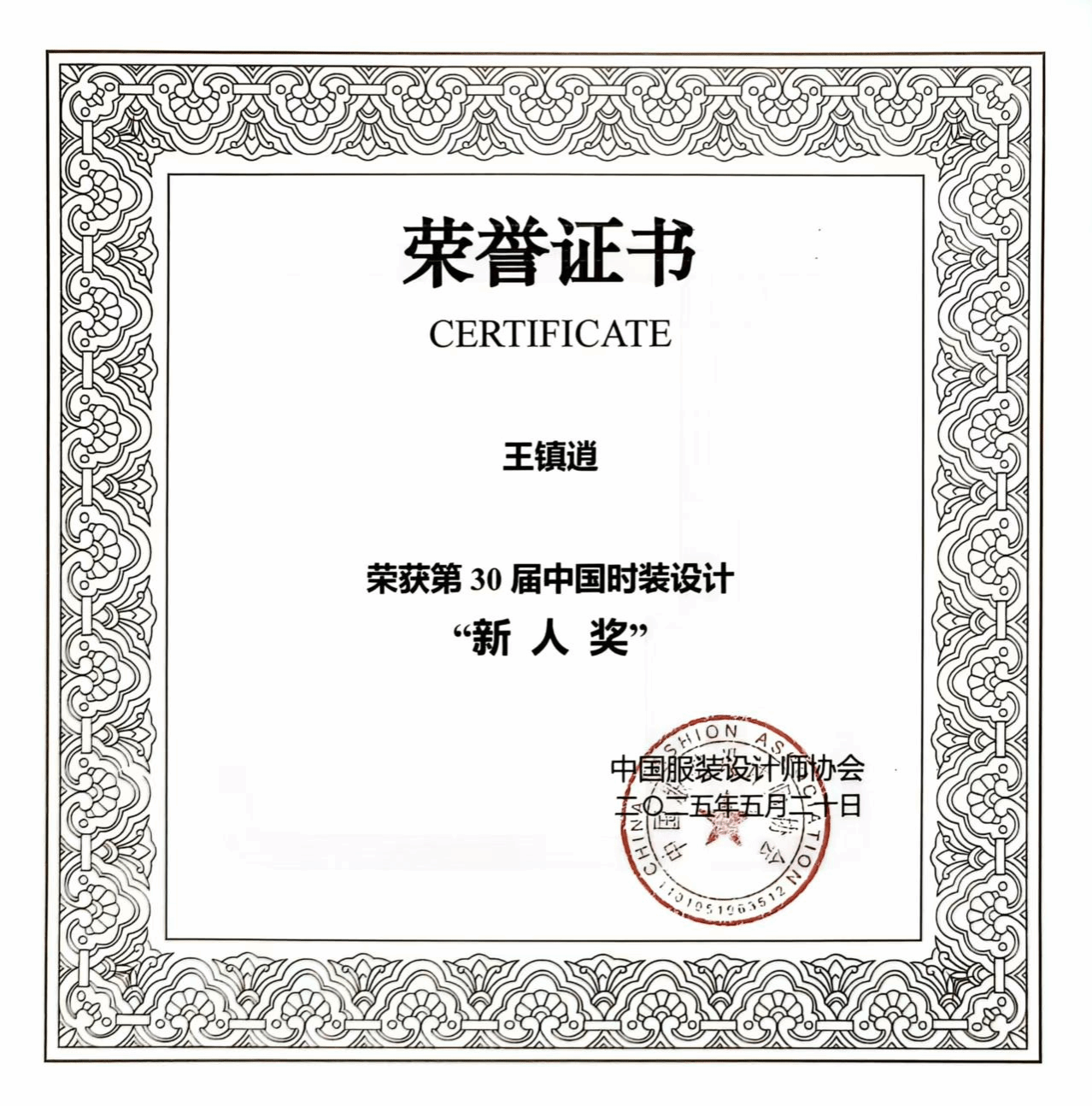 此次评选活动吸引了来自全国 28 个省市自治区 108 所专业院校的 888 位 2025 届时装设计专业本专科毕业生及在读研究生参与。经过层层筛选,共有 66 名选手入围终评。王镇逍在现场手绘效果图、立体裁剪、作品答辩及走秀等多个环节的考核中,展现出扎实的专业功底和独特的设计理念,最终以优异的成绩位列第三名,成功斩获 “新人奖”。