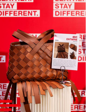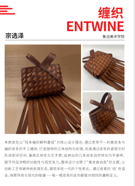 《缠织》的灵感是源于对“线”这一基础元素的打破与重塑。当观察传统皮具时,总被规整的形态与固定的结构所局限,便开始思考:能否以真皮为“线”,用编织这一充满手工温度的方式让“线”拥有自主的走向?于是宽窄不一的真皮条与编织皮条成为创作载体,它们不再是服务于固定版型的辅料,而是能自由缠绕、交织的主角——紧密交织时自然形成兼具实用与艺术感的包身空间,延伸而出时又顺势化为手提带,让功能与形态在“线”的流动中自然融合。这份灵感也藏着对传统与现代碰撞的探索:每一根皮条的缠绕角度、每一处交织的节点,都是对既定规则的重新定义,用“线”的无序与有序,诠释“真皮真自我”的内核,让皮具不再是单一的收纳工具,更成为年轻一代打破束缚、表达个性的载体。