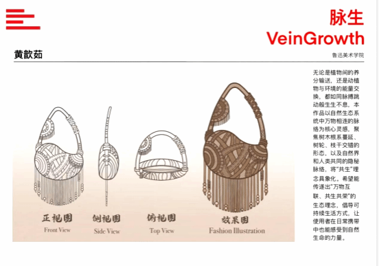《脉生》的灵感来源于无论是植物间的养分输送,还是动植物与环境的能量交换,都如同脉搏跳动般生生不息,本作品以自然生态系统中万物相连的脉络为核心灵感,聚焦树木根系蔓延、树轮、枝干交错的形态,以及自然界和人类共同的隐秘脉络,将“共生”理念具象化。希望能传遂出“万物互联、共生共荣”的生态理念,倡导可持续生活方式,让使用者在日常携带中也能感受到自然生命的力量。