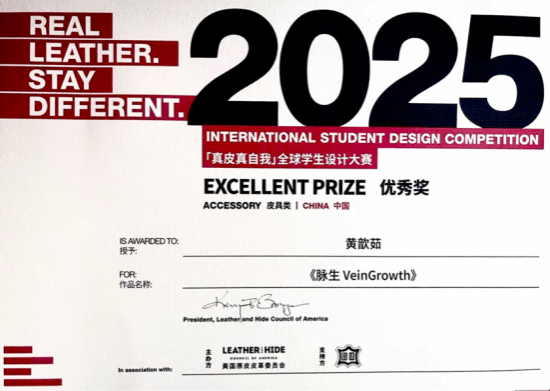 ▲学生冯蕊诗、黄欣茹获2025“真皮真自我”全球学生设计大赛中国大陆赛区“优秀作品奖”