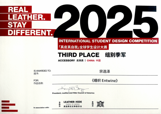 ▲学生宗选泽获2025“真皮真自我”全球学生设计大赛中国大陆赛区皮具类季军