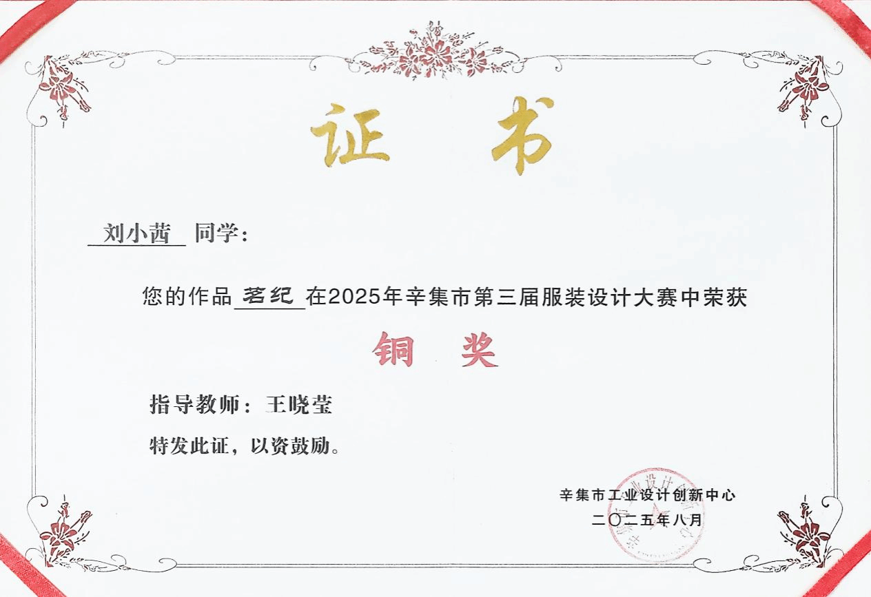 ▲河北国际工业设计周第三届服装设计大赛“铜奖”获奖证书