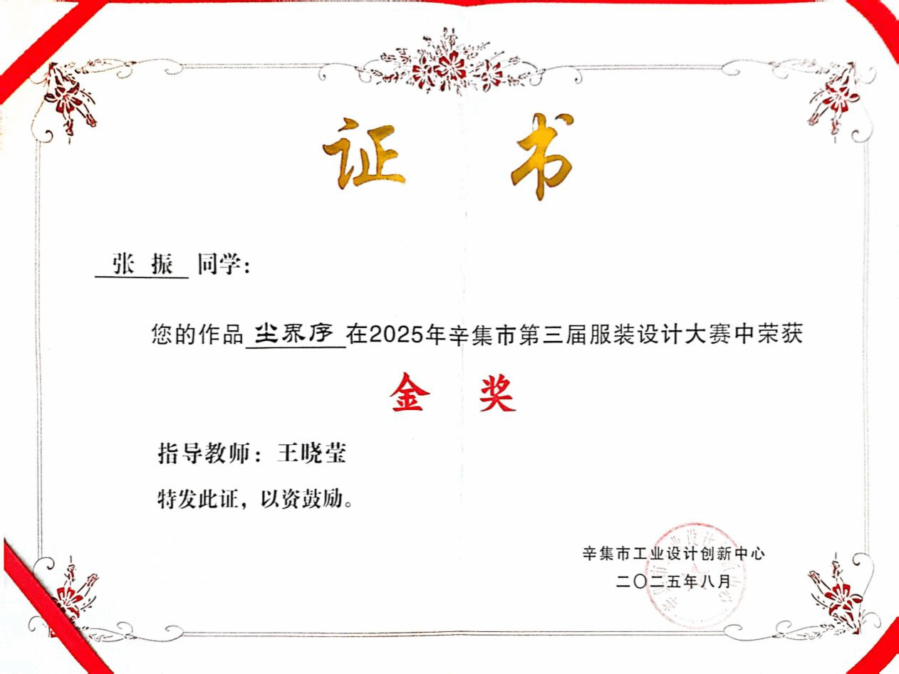 ▲学生张振获得河北国际工业设计周第三届服装设计大赛“金奖”