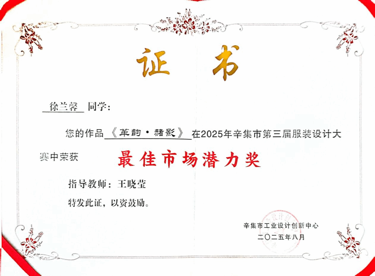 ▲河北国际工业设计周第三届服装设计大赛“最佳市场潜力奖”获奖证书