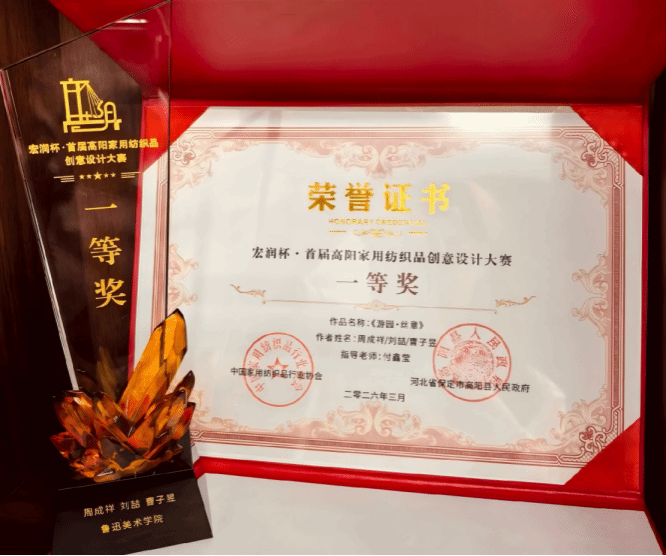 我院师生在该大赛中获得1项一等奖,1项三等奖及多项入围奖的可喜成绩,其中2023级染织专业周成祥/刘喆/曹子昱同学的《《遊园·丝意》作品获得一等奖,2023级染织专业刘馨同学的《椰林梦绮》作品获得三等奖,付鑫莹老师获得优秀指导教师奖,我院获得优秀组织奖。同时,获奖作品在上海国家会展中心2026中国国际家用纺织品及辅料(春夏)博览会上进行了展示,并获得了业界的一致好评。