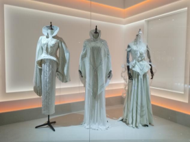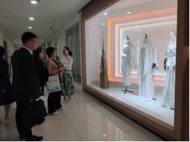 ▲鲁迅美术学院染织服装艺术设计学院学生姜元智作品在柞蚕文化产业园现场展览