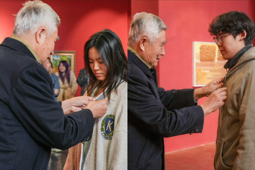 在一众艺术佳作的见证下,我作为一名拥有44年党龄的老共产党员为新团员们佩戴团徽,当金属质地的团徽别在青年学子胸前时,仿佛完成了一场跨越代际的信仰传递,那徽章的重量,是荣誉,更是责任和托付。