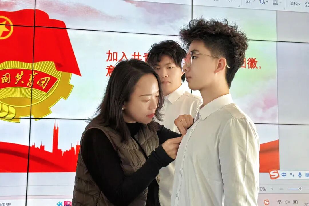 在热烈的掌声中,学院党总支副书记高超老师为新团员代表郑重佩戴上闪亮的团徽。这枚小小的团徽,不仅是团员身份的象征,更承载着使命与担当。它时刻提醒着每一位团员,要严格要求自己,勇于担当作为,在同学中发挥表率作用。