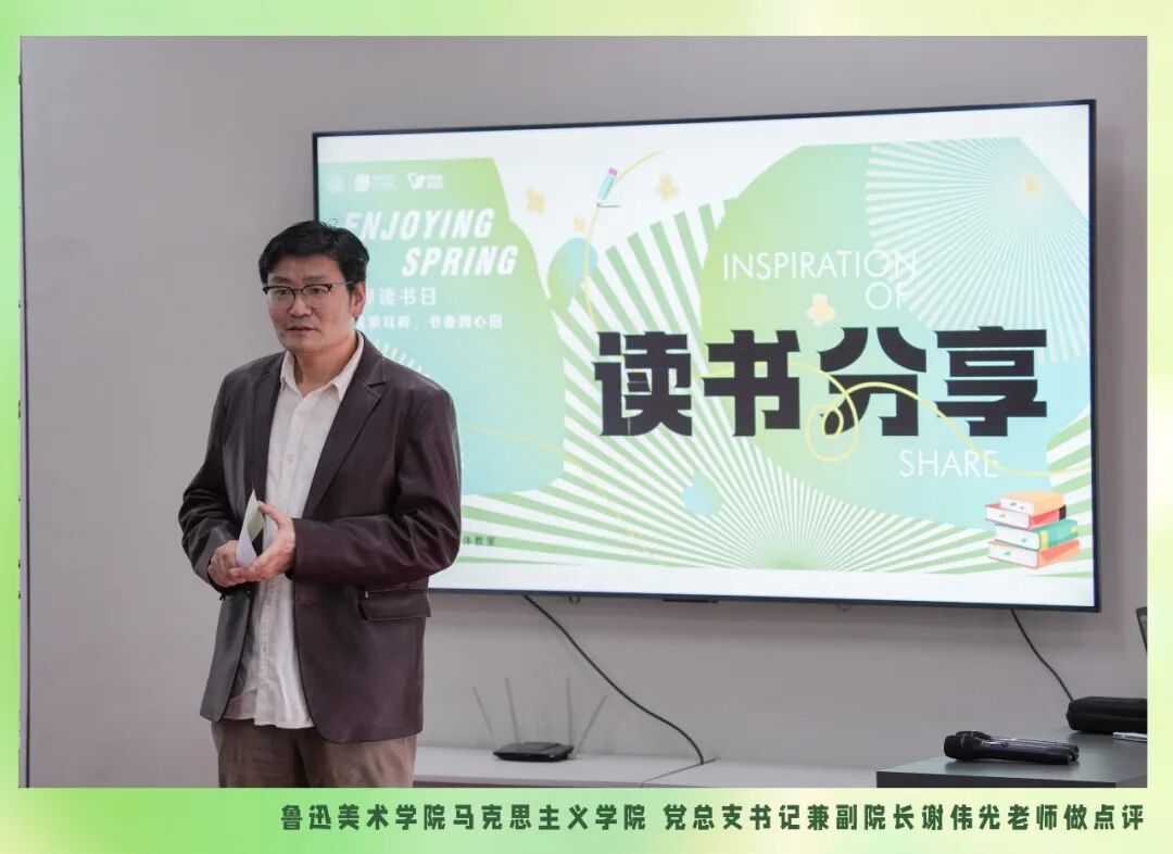 活动结束后,鲁迅美术学院马克思主义学院党总支书记兼副院长谢伟光老师作出精彩点评。谢老师说,《失落的一角》、《人间小满》、《理想家:2025》和我们的生活、专业息息相关,都是以绘本、线条、漫画这种方式图文结合来表达作者的一些思想和人生道理;《什么样的爱值得勇敢一次》、《简爱》关于爱情,爱情是值得我们去勇敢追求的,但更重要的是,我们要在追求爱情的过程中,不断地成长和强大自己;《十八岁出门远行》关于咱们的生活,教会我们如何面对成长的挑战和困难,如何保持一颗纯净和善良的心,去追寻自己的梦想和幸福。记得培根说过一句话:“读史使人明智,读诗使人灵秀,数学使人周密,科学使人深刻,伦理学使人庄重,逻辑修辞之学使人善辩。”所以谢老师也希望大家在艺术、生活、爱情之外,还能够进一步开拓自己的视野再多读一些书,让自己慢慢地像大树一样茁壮地成长起来,从各个方面都发展起来。