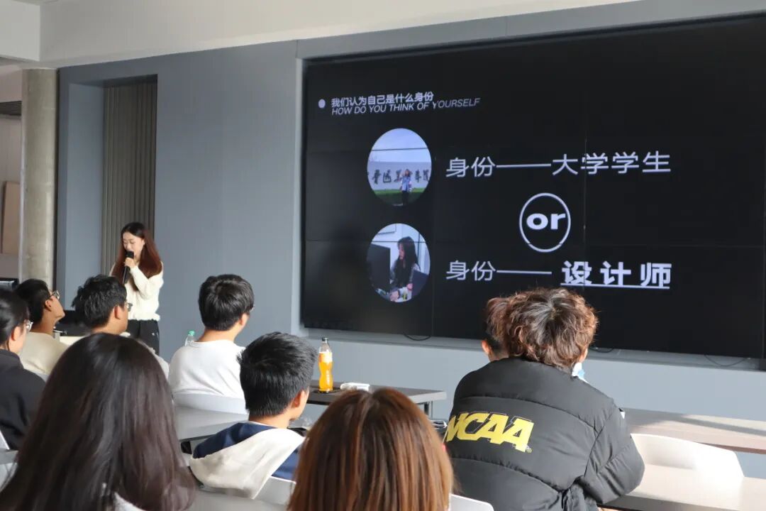 齐海彤学姐为同学们带来了主题为“AI时代中设计行业的就业与创业”的经验交流分享会,在分享会上,她回顾了自己从入学时的点点滴滴,参与实习实践项目的经验,到最后一步步成为设计总监的历程。同时也向同学们分享了设计师对于设计的理解以及创业的经验。并从以下几个方面进行了分享: