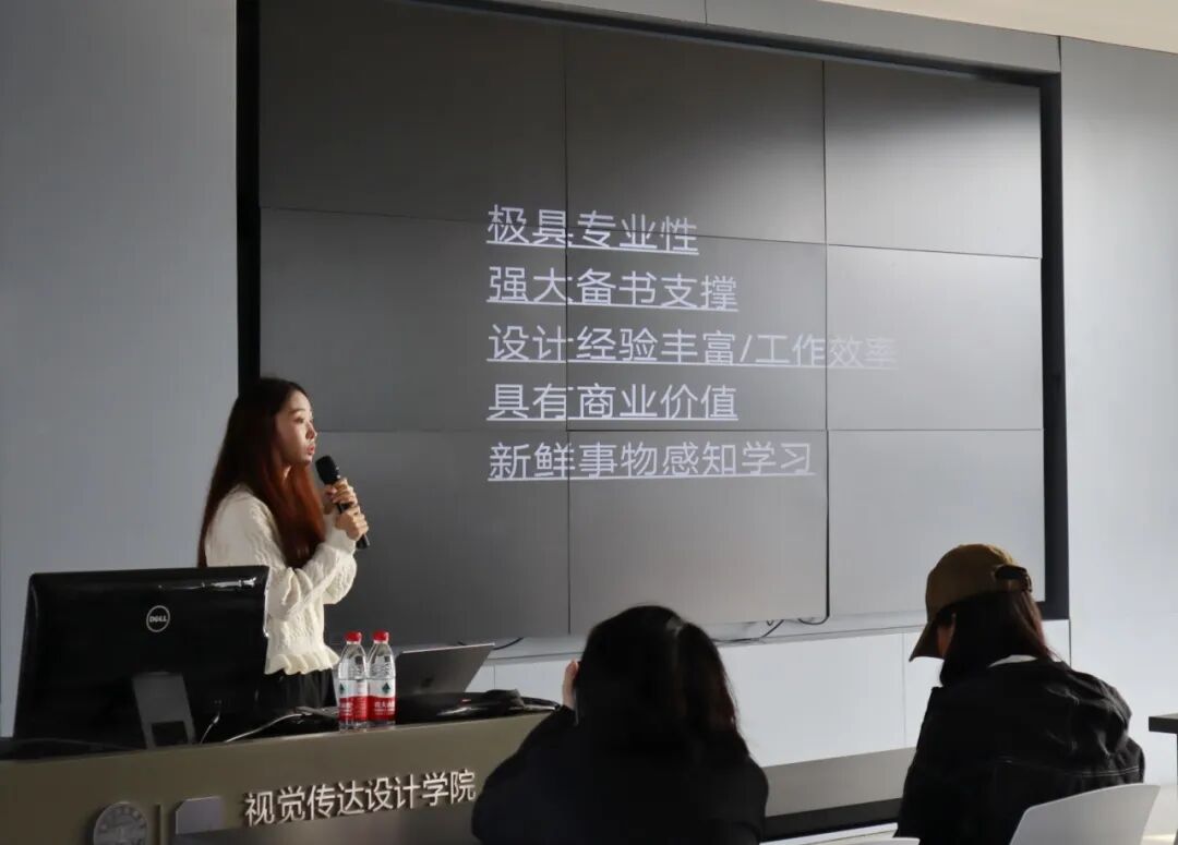 2024年10月25日,中午12点30分,视觉传达设计学院邀请了元一设计联合创始人、设计项目总监、视觉传达设计学院2022届毕业生齐海彤学姐在多功能教室为同学们带来了“AI时代中设计行业的就业与创业”经验交流分享会。
