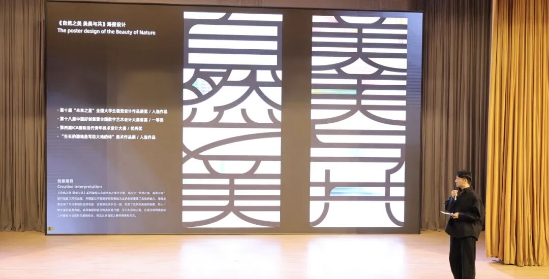 在中国美术家协会举办的第十届“未来之星”全国大学生视觉设计作品展览中,成功入选的三组同学进行分享,分别是《喜积》——文创设计、《自然之美 美美与共》——海报设计、《冬韵盛京》——综合项目设计。刘亚璇老师进行点评。