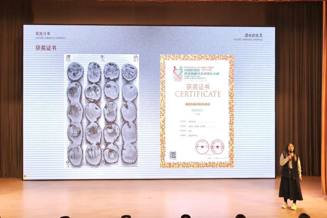 在第十八届中国好创意暨全国数字艺术设计大赛中获一等奖的三组优秀作品,分别是《遗失的生灵》、《长安万象》、《德润人生》,作品获奖者上台分享。王坤老师进行了点评。