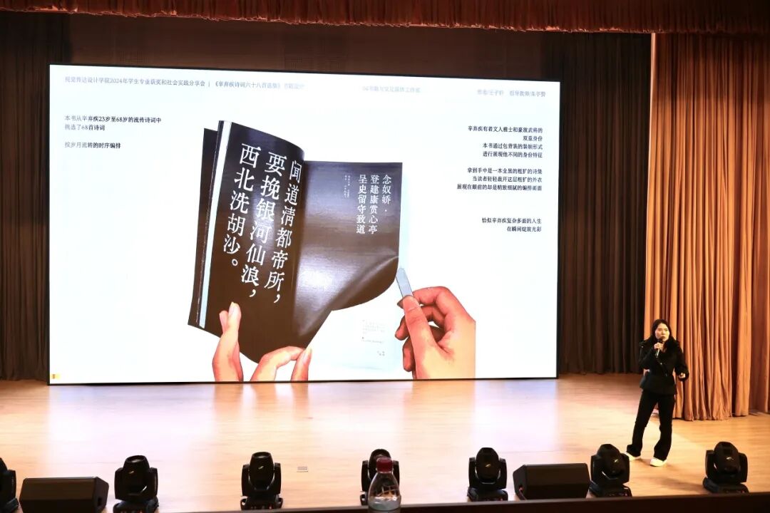 朱亭赞老师对《辛弃疾诗词选》进行了介绍。书籍创作选题是辛弃疾的68首诗词创作,书籍内容和排版设计及材质选择保持一致,展现了辛弃疾的豪迈狂放和细腻敏锐。整本书在编排和配色上都很用心。朱老师对上述四组作品进行了综合点评,同学们从社会关注、诗词、剪纸文化、非遗文化记忆的角度进行选题与创作,体现了将社会关注、文化传承、时代精神和个人审美相融合的设计尝试,并在其中加入自己的思考与突破,体现了当代青年人良好的艺术风貌。