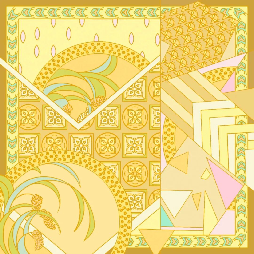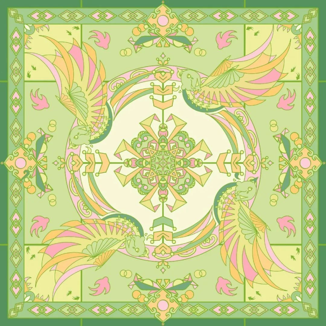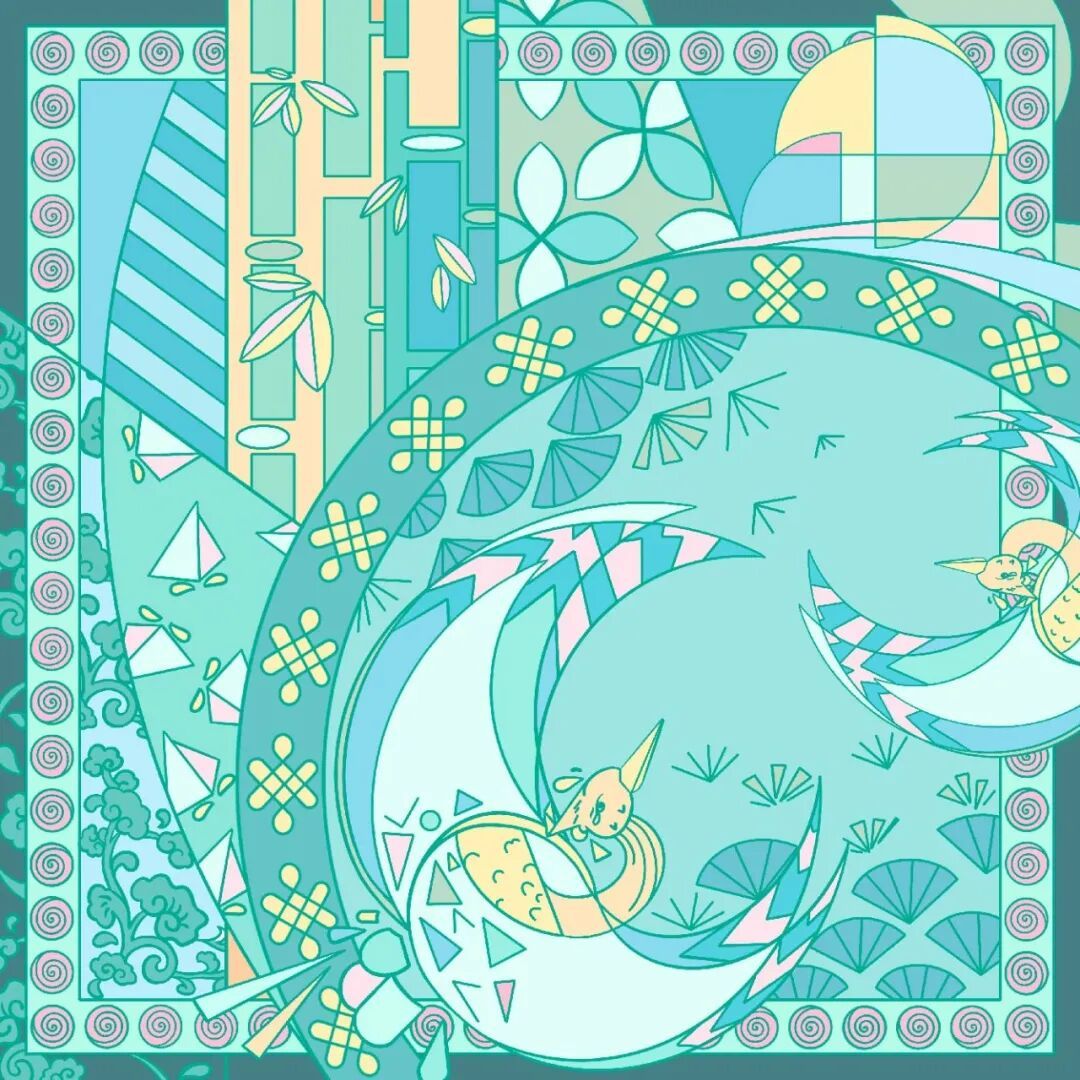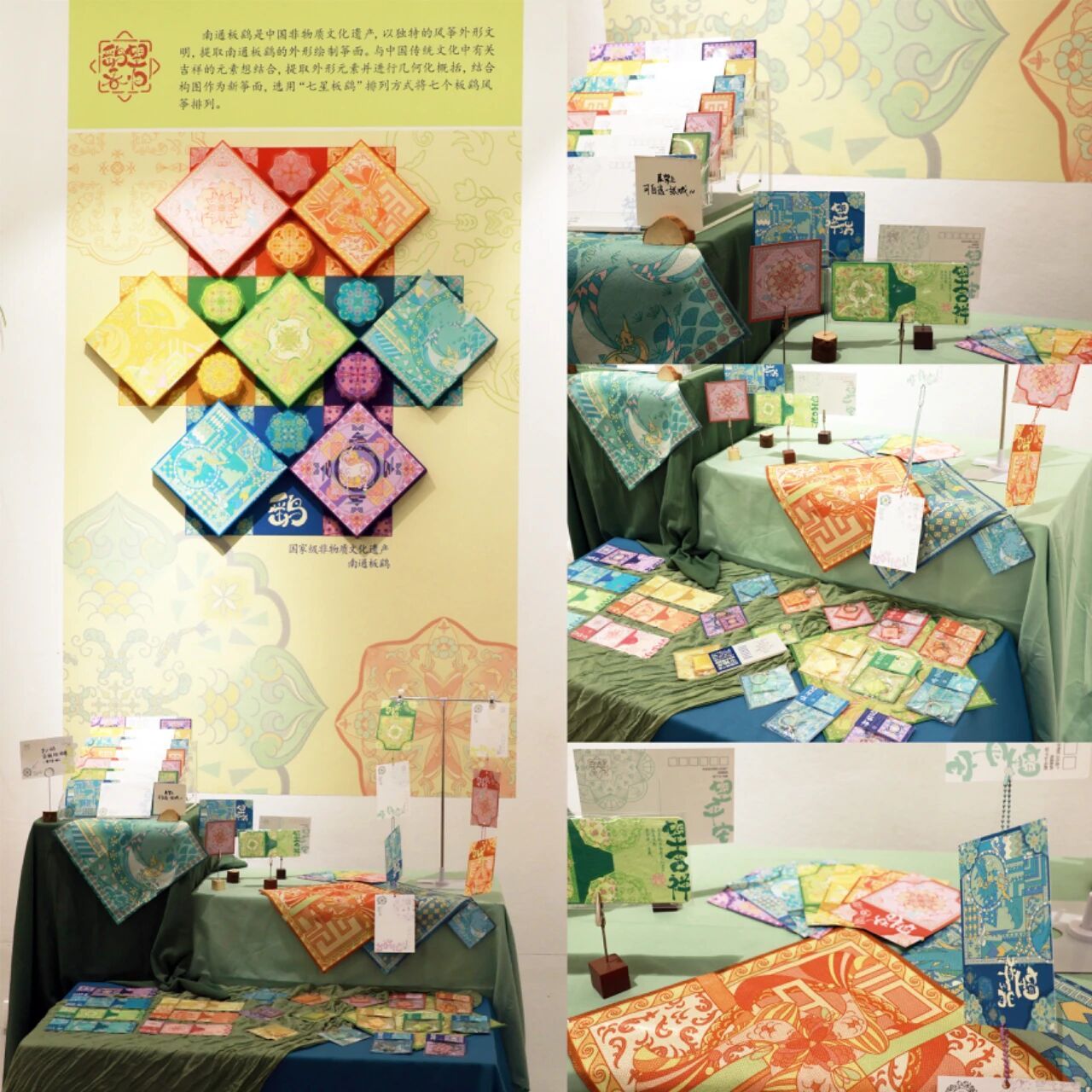 南通板鹞是中国非物质文化遗产,以独特的平面六角风筝外形而闻名,提取南通板鹞的外形绘制筝面。与中国传统文化中有关吉祥的元素春燕,锦鲤,祥龙,荷花等相结合,提取外形元素并进行几何化概括重组,结合构图作为新筝面,选用“七星板鹞”排列方式由7个风筝角角相连排列而成。