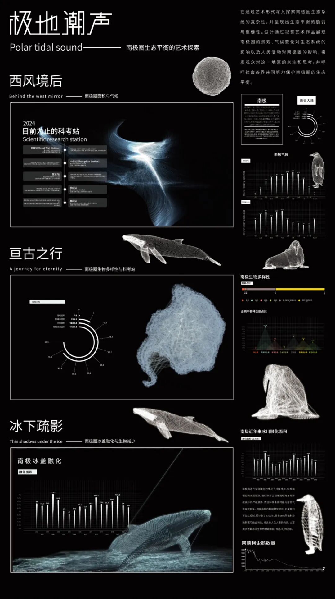 在通过艺术形式探索南极圈生态系统的复杂性,并呈现出生态平衡的脆弱与重要性。设计通过视觉艺术作品展现南极圈的景观、气候变化对生态系统的影响以及对南极圈的影响,引发观众对这一地区的关注和思考,并呼吁社会各界共同努力保护南极圈的生态平衡。