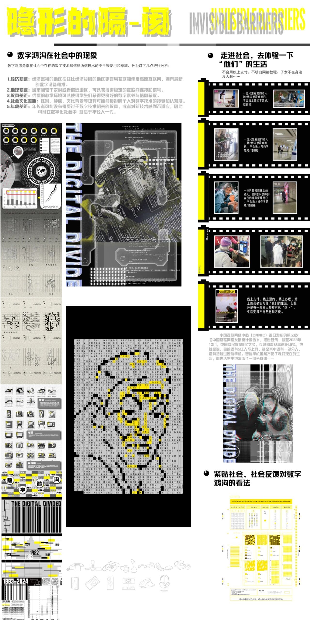 本设计的主题是数字鸿沟。作品中最引人注目的一部分,即用围棋的手法制作的数据信息可视化,初衷是希望把一百位受访者的调研数据统计出来。而围棋是最具中国元素代表的事物,每一颗棋子都代表了一位受访者,黑白棋代表了不同调研结果,组合在一起问卷调研的每一道题目都可以形成一个不同的棋局。这样一来,调研数据的信息可视化就变得更具有新的意义。希望可以通过此设计引起大众的广泛关注,推动多学科一起解决数字鸿沟这一社会问题。