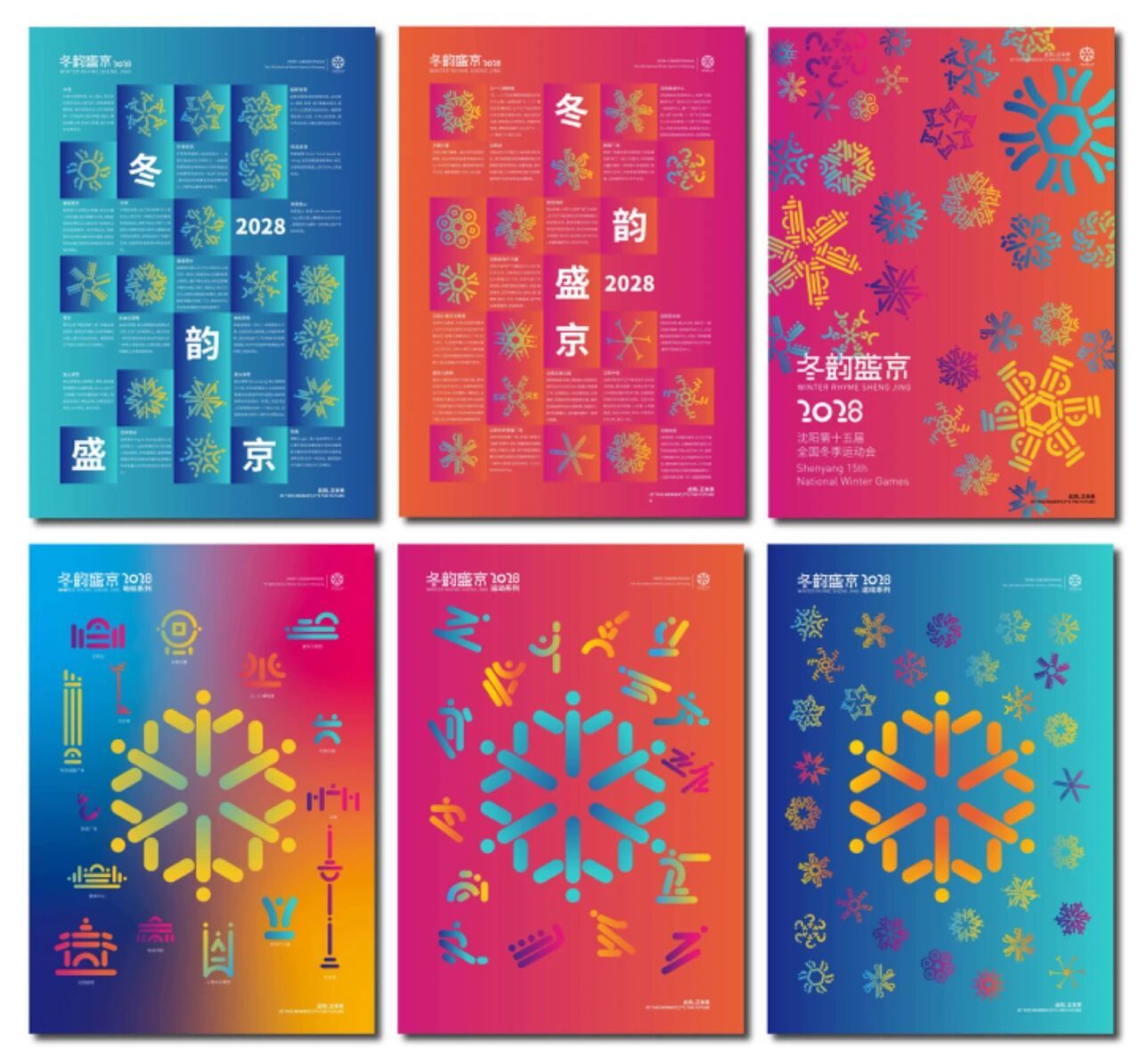 在华夏大地的广袤疆域中,冰雪之韵独特而瑰丽,它不仅是大自然赠予我们的礼物,更是激发我们挑战自我、超越极限的源泉。2028年,第十五届全国冬季运动会将由辽宁承办,作为在辽宁学习与成长的鲁迅美术学院的学子,秉持着“设计为人民”的设计理念,决定以“第十五届全国冬季运动会可持续设计”为主旨,拟定“冬韵盛京”为主题。我们通过平面设计的独特语言,捕捉冰雪运动的激情与魅力,展现运动员们顽强拼搏、勇攀高峰的精神风貌。在设计过程中,我们深入研究了冰雪运动的视觉元素,以及沈阳非遗文化、美食、人物、动物、地标、建筑等并从中提炼出最具代表性和感染力的元素,如雪花、运动员、地标等,将它它们巧妙地融入设计中,形成独特的视觉风格。并最终形成展板与动态设计。