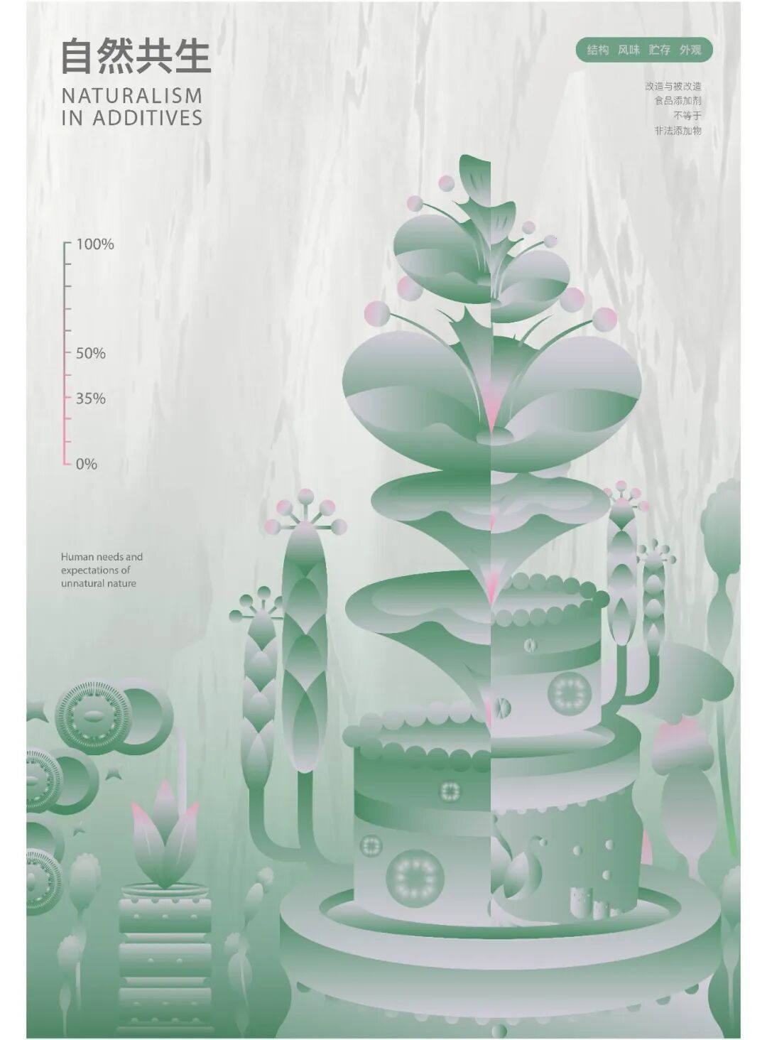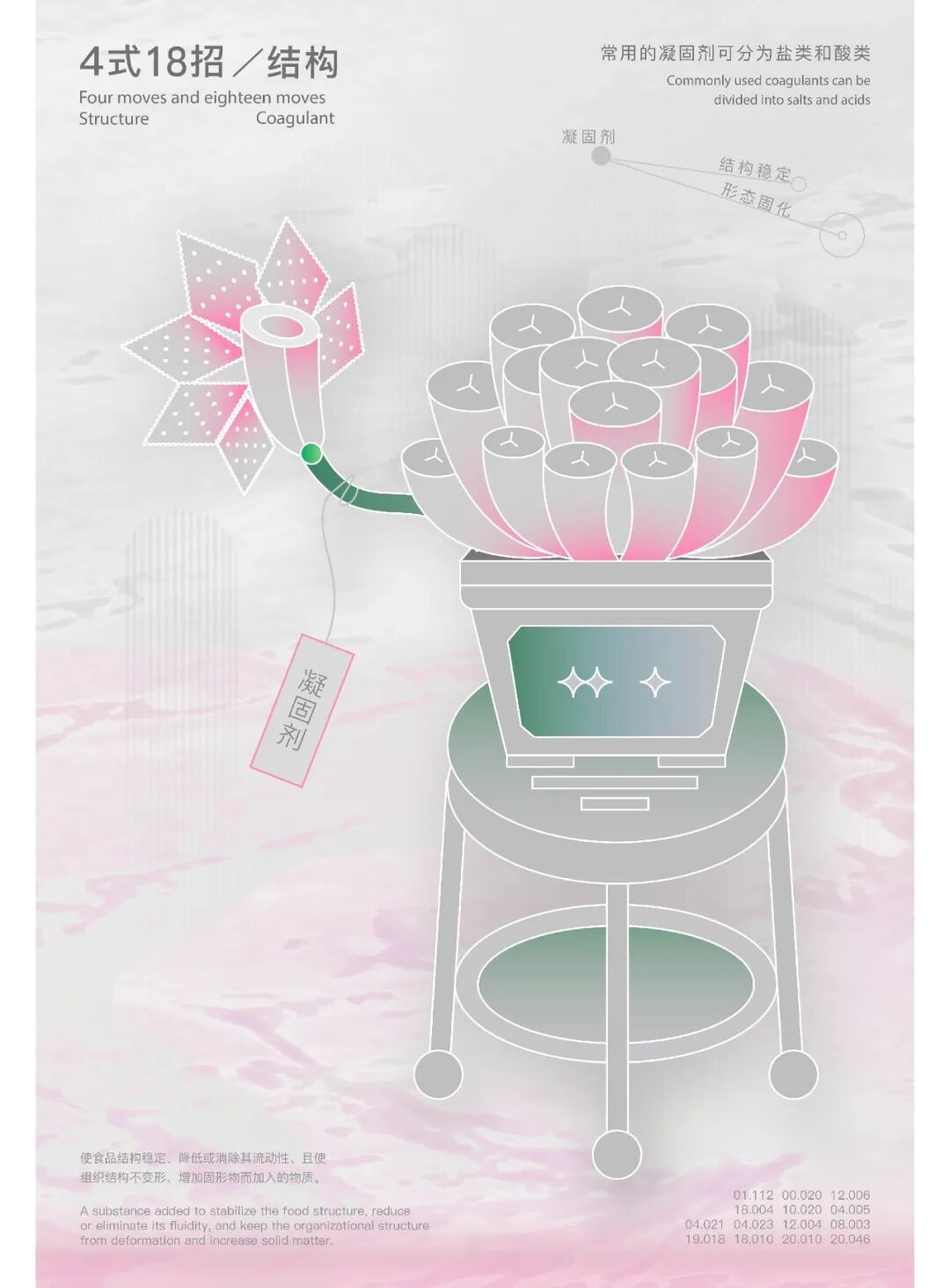 作品关注社会现象,探讨添加剂的功过是非。自然主义的代入使这件作品充满了设计隐喻,每一个元素背后都蕴含着丰富的象征意义,比如铲子来自于花园,又指代了餐具勺子。从现实中出发,保持着清醒和坚定,她们通过对主题的独特理解和深刻洞察,是对当下生活的一种思考,也呈现出一种精神的飞升,这就是设计的力量。