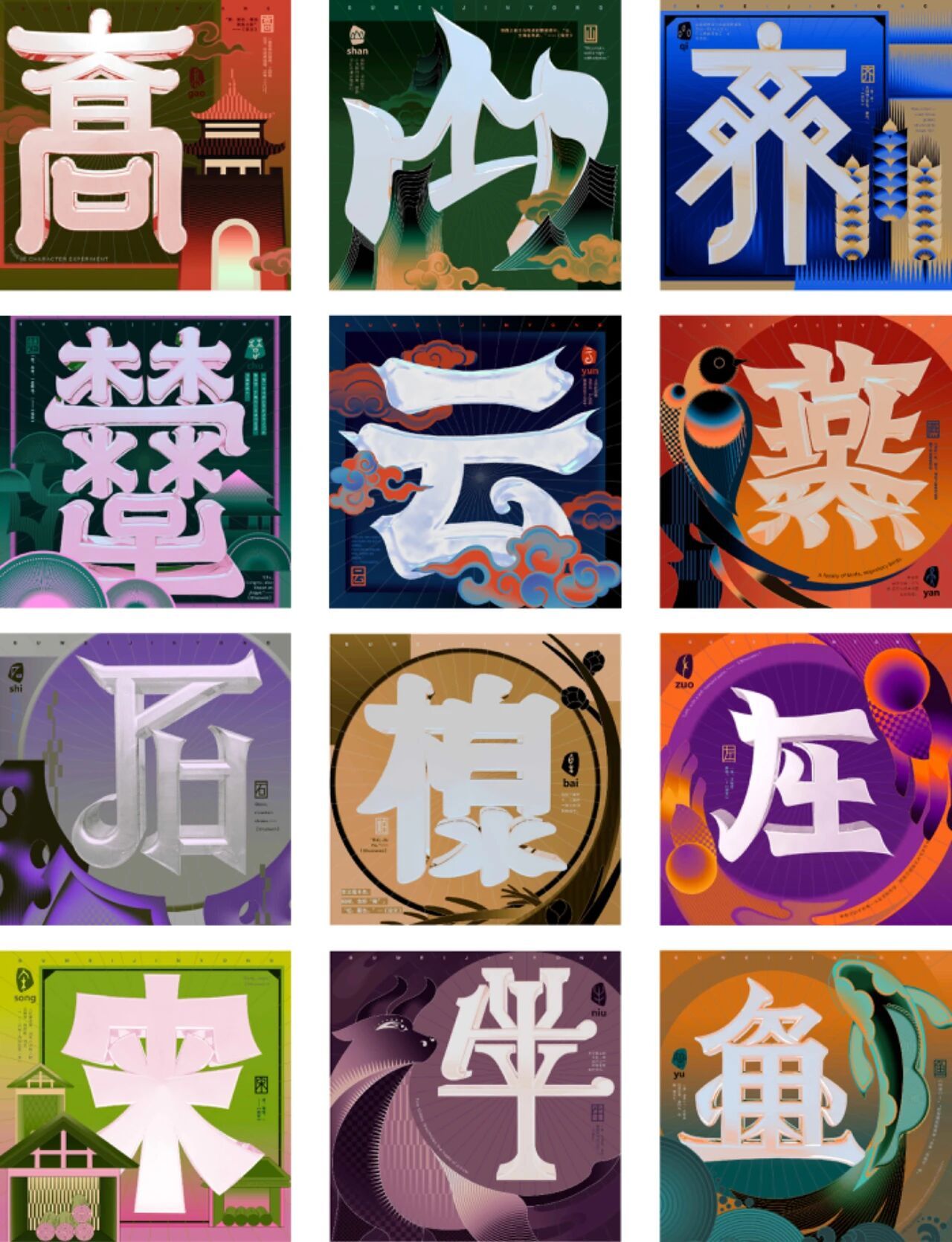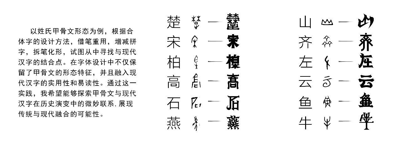以姓氏甲骨文形态为例,根据合体字的设计方法,借笔重用,增减拼字,拆笔化形,试图从中寻找与现代汉字的结合点。在字体设计中不仅保留了甲骨文的形态特征,并且融入现代汉字的实用性和易读性。通过这一实践,我希望能够探索甲骨文与现代汉字在历史演变中的微妙联系,展现传统与现代融合的可能性。