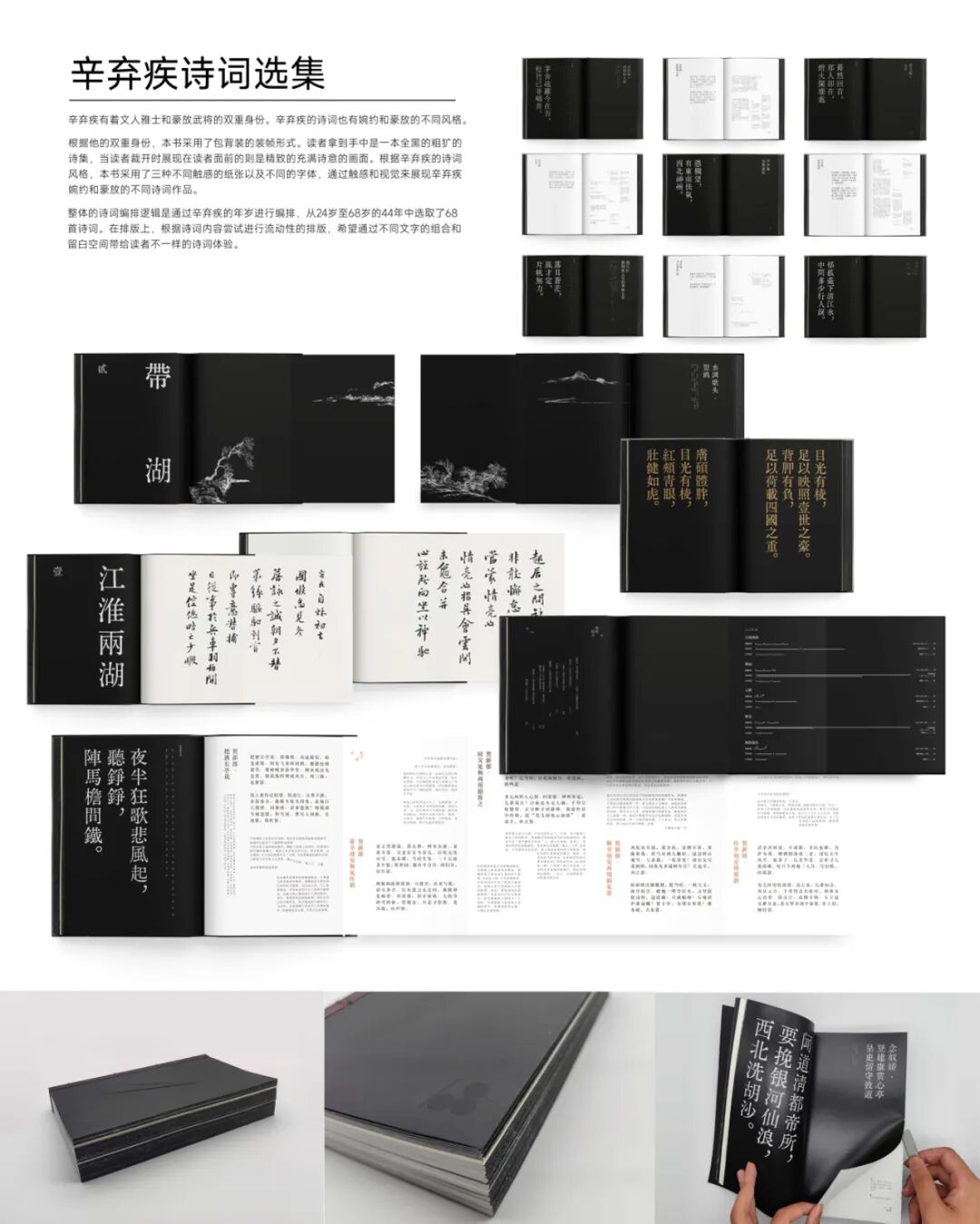 本书设计灵感源自辛弃疾的双重身份——文人雅士与豪放武将,采用包背装装帧,外观粗犷漆黑,象征着武将的豪迈,裁开后则展现出精致诗意的内页,文如其人一面。为呼应辛弃疾诗词中婉约与豪放并蓄的风格,精选三种触感纸张搭配各异字体,让读者在触摸与阅读中,深切感受诗词的韵律与情感。