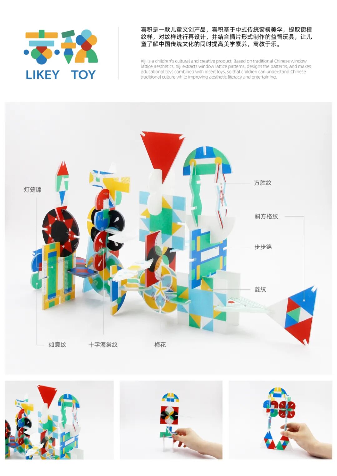 《喜积》是一款儿童文创产品,基于中式传统窗棂美学,提取窗棂纹样,对纹样进行再设计,并结合插片形式制作的益智玩具。插片的形式可以锻炼儿童的思考能力和动手能力,助力儿童发育的同时使儿童受到传统文化的熏陶,让儿童了解中国传统文化的同时提高美学素养,寓教于乐。