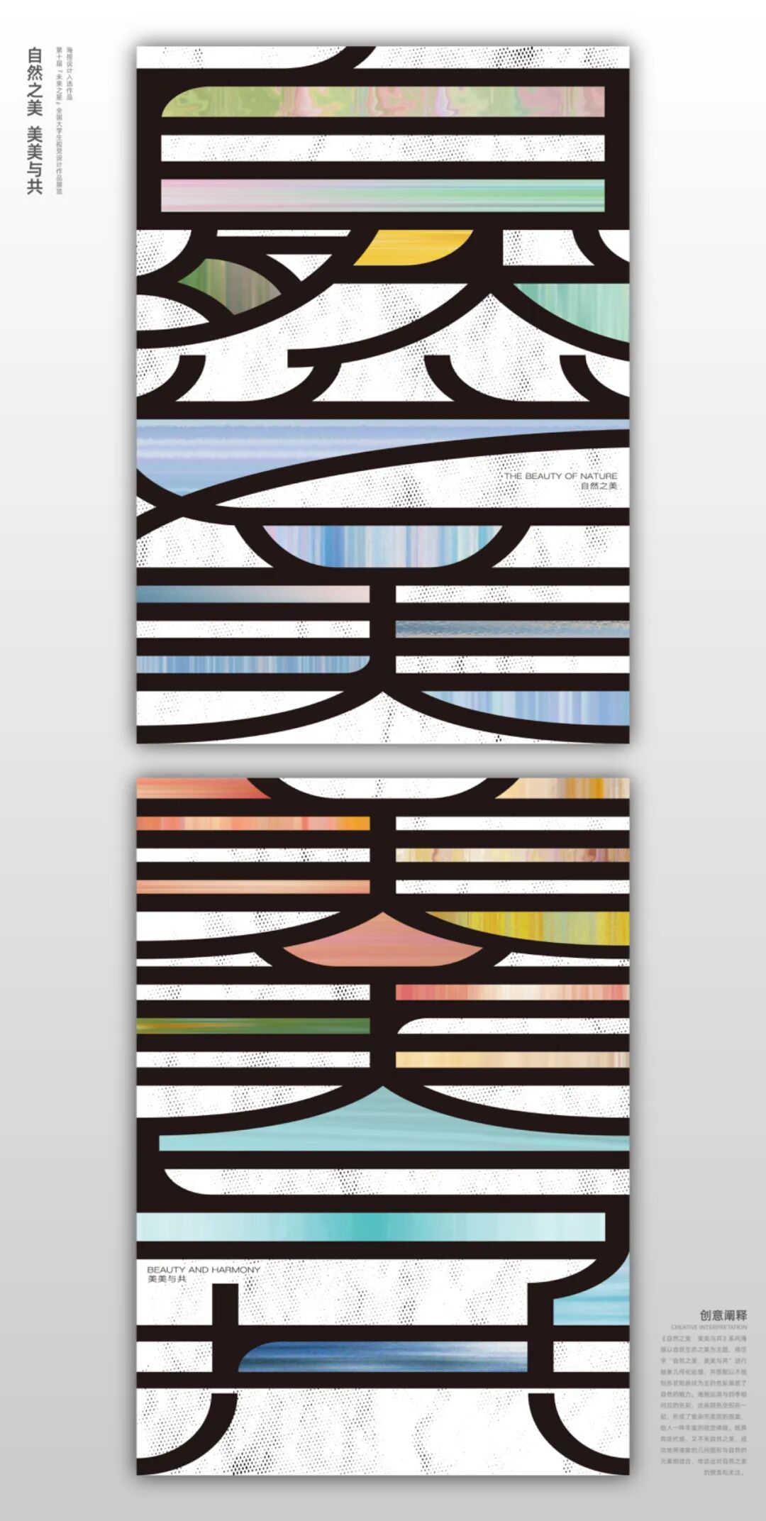 《自然之美 美美与共》系列海报以自然生态之美为主题,将汉字“自然之美、美美与共”进行抽象几何化处理,并搭配以不规则形状和条纹为主的色彩展现了自然的魅力。运用了与四季相对应的色彩,这些颜色交织在一起,形成了复杂而美丽的图案,给人一种丰富的视觉体验。