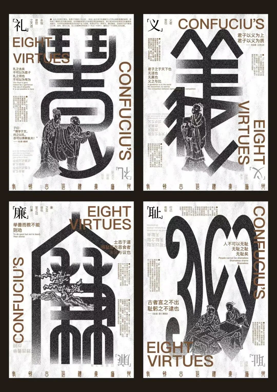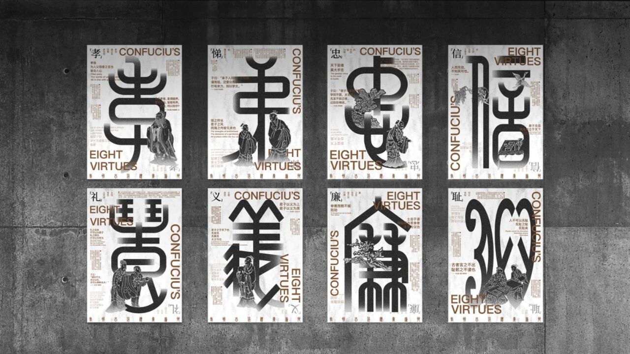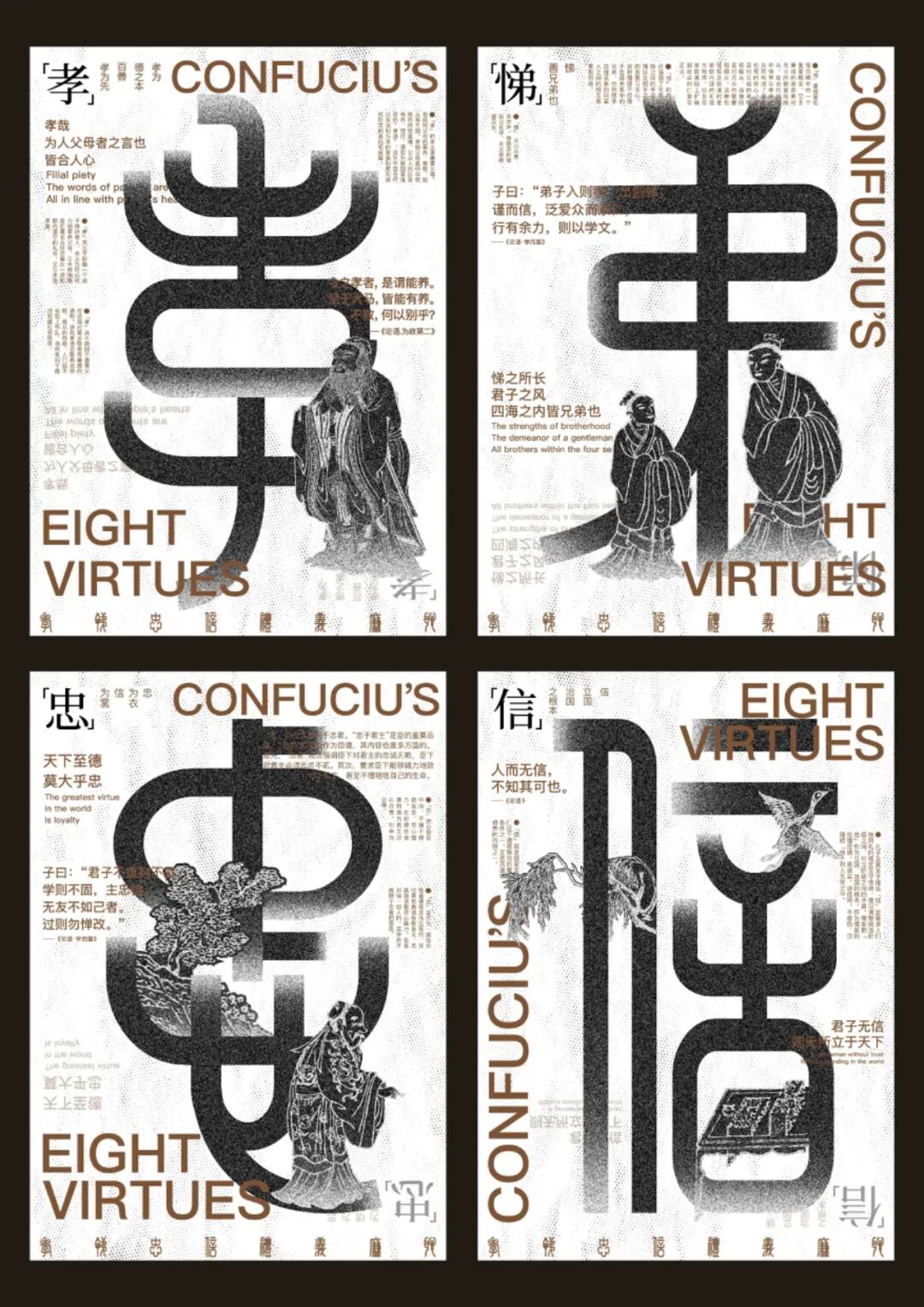 本系列海报以“孔子八德”为主题,旨在弘扬中华传统文化核心价值观。设计中运用了甲骨文这一古老的文字形式,象征着对历史的追溯与文化的传承。整体系列海报采用黑白色调不仅增强了视觉冲击力,还赋予了一种沉静与肃穆的氛围。通过这一系列海报,希望观众不仅能感受到孔子八德的精神力量,还能对甲骨文这一珍贵的文化遗产产生浓厚的兴趣。