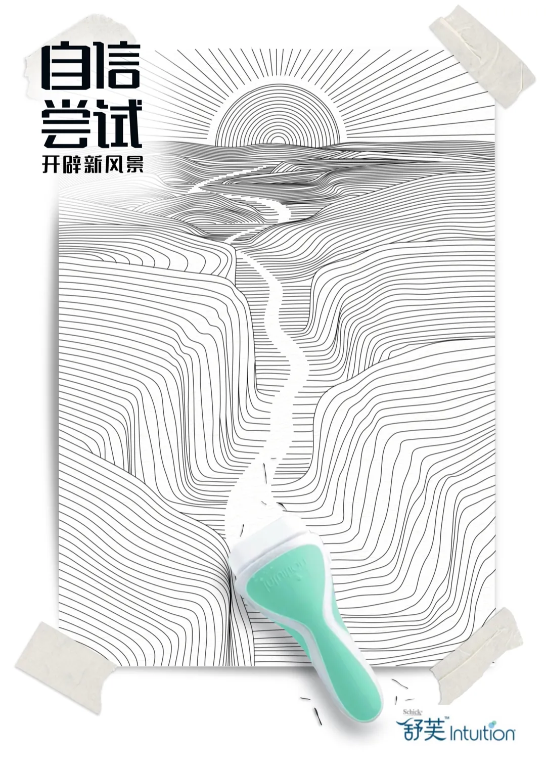该组作品的创意点是“自信尝试 效果立显” 。作品采用借喻的表现形式,用黑色的线条比喻身体的毛发。第一张作品荒芜的丘陵和刚刚开垦的河流形成对比,意在鼓励女性自信尝试该产品,发现生活中的新风景亦或是使自己成为一道靓丽风景线。第二张作品粗糙的树皮和光滑的树芯形成对比,体现了效果立显的产品优势 产品所过之处已经没有黑色的线条,而是散布着一些橡皮屑,以此来体现一刮即净的卖点。作为一张广告海报,作品整体以黑白色调为主 引导大家将第一视觉重心放在产品上。