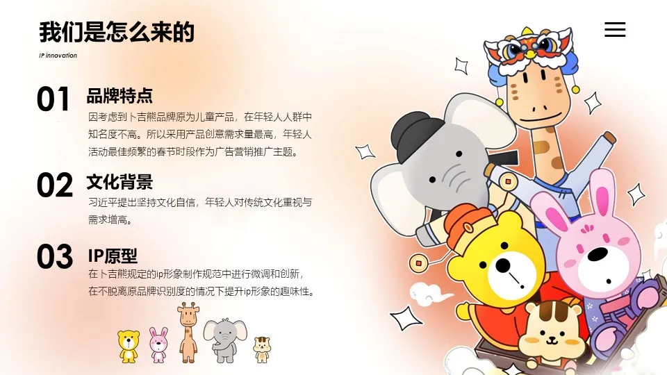 在本期课程中,我们以团队合作的方式完成了大广赛“卜吉熊”营销策划案。在设计和策划中结合了传统文化与时尚潮流元素重新设计了卜吉家族的五个ip形象,以ip形象为主题进行一系列的品牌拓展和广告策划案的制作。通过本门课程的学习,我们逐步了解怎样进行广告策划,怎样发挥原品牌优势取长补短,同时也增强了我们的团队协作能力,让我们每个人都有所成长。