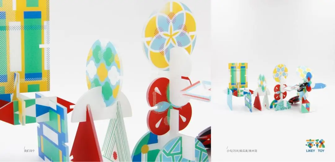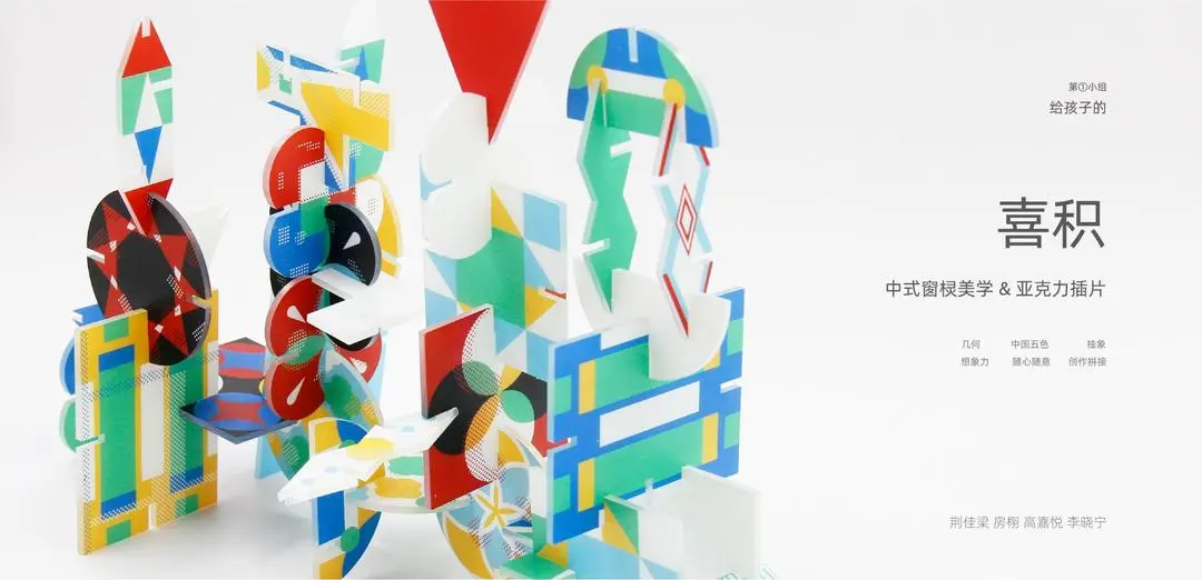 喜积是一款针对于儿童的创意插片玩具,喜积立足于中式传统窗棂美学,中式窗棂形态各有特色,极具美感。从中提取窗棂纹样,并对纹样进行再设计,形成了鲜明的视觉特征。颜色选取了赤青黄白黑传统五色,以及在千里江山图中提取的石青和石绿。材质选用透光性的磨砂亚克力片,结合创意插片形式制作出了儿童创意插片益智玩具。旨在让儿童了解中国传统文化的同时提高美学素养,寓教于乐。
