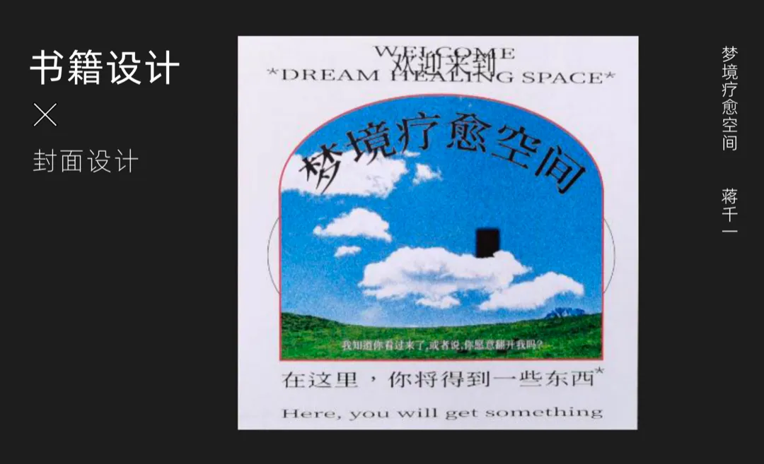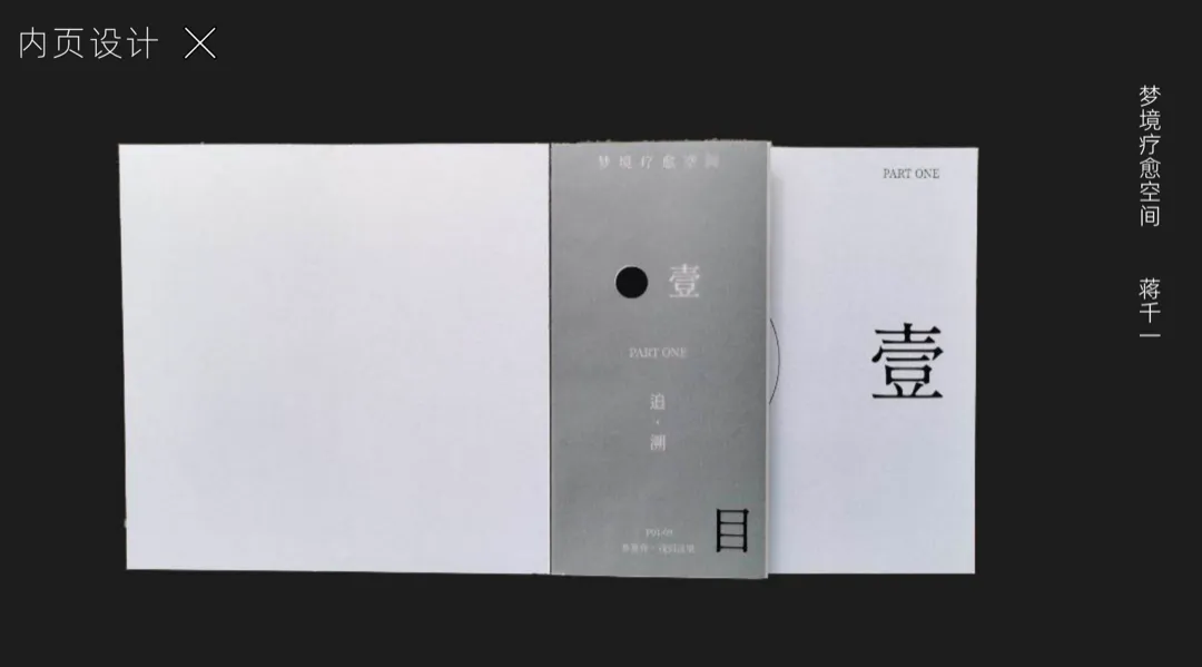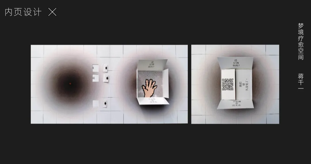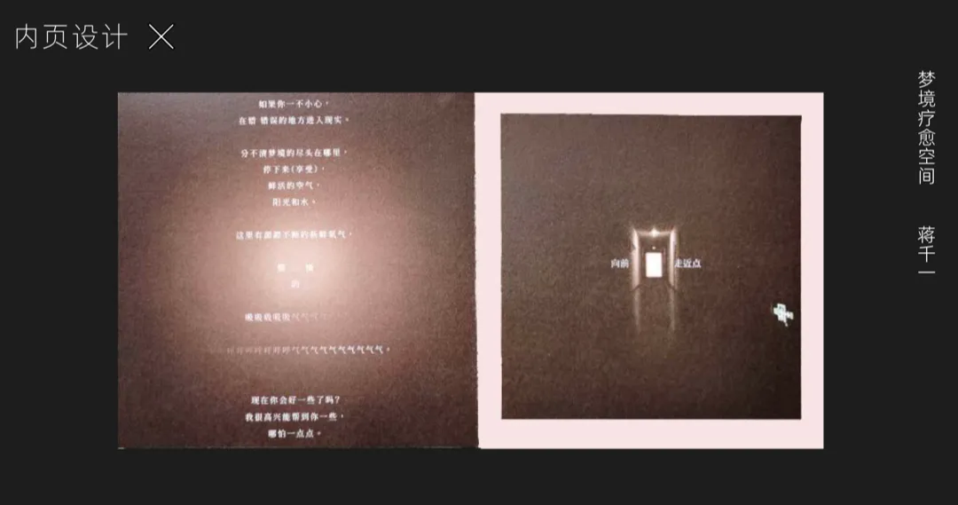 《梦境疗愈空间》是将梦核与艺术设计疗愈相结合,基于互动体验的艺术疗愈的功能性书籍设计,针对PTSD患者、躁郁症患者、抑郁症患者等患有心理疾病患者。全书以对话的形式将读者代入到“梦境空间”,以书籍作为容器给予读者藉慰。用对话的方式让阅读此书的读者放松平静下来,与自己沟通、让思绪放空,通过文字和设计的力量引导读者完成心理的疗愈过程。此外,该书与传统的功能性心理书籍不同,《梦境疗愈空间》从版式设计、结构设计、材料以及AR的融入,让读者在阅读书籍的同时感受到趣味和惊喜。