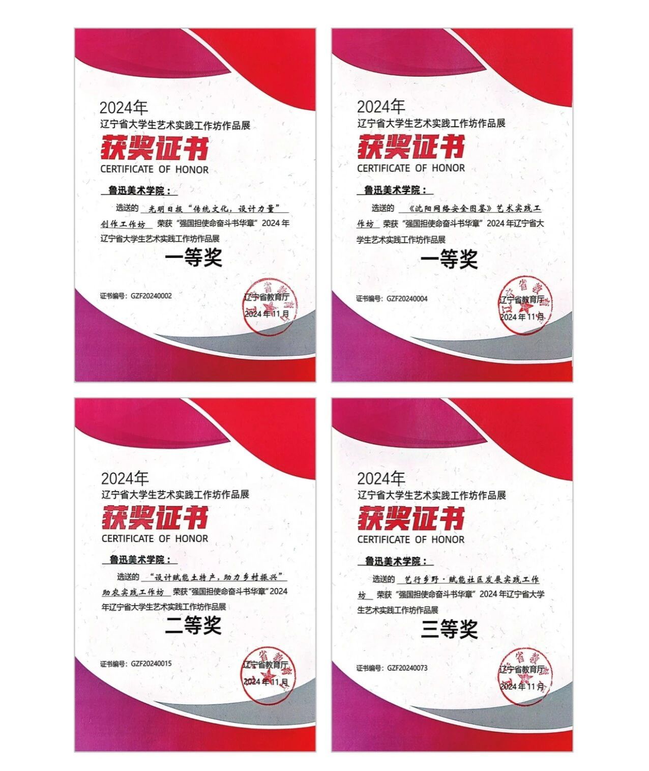 近日,由辽宁省教育厅组织开展的“强国担使命 奋斗书华章”2024年辽宁省大学生艺术展演活动获奖名单揭晓,视觉传达设计学院4组参赛作品获奖,2组作品荣获一等奖,1组作品荣获二等奖,1组作品荣获三等奖。在2024年辽宁省大学生艺术实践工作坊作品展中,各位指导老师积极引导学生用设计助力文化传承、地方发展、乡村振兴、社区治理,以卓越的指导能力,助力学生绽放光芒。李晨、刘仁、祝军、王炜丽、朱亭赞、王坤、孟宪航七位老师荣获“...