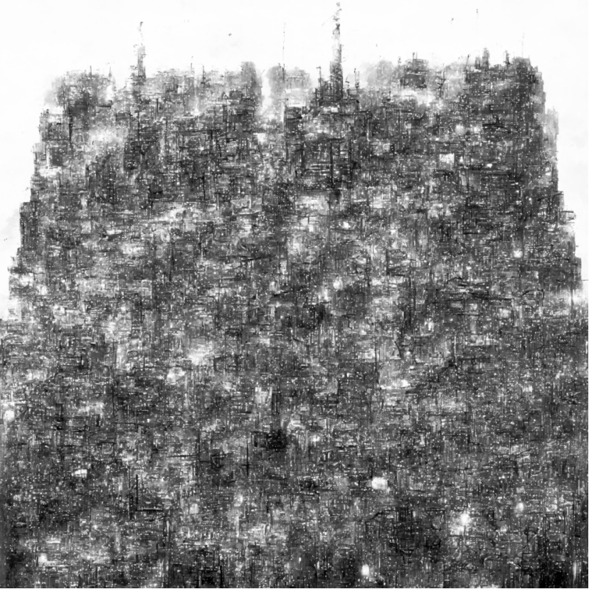 《沉积岩》是由16块30x30cm的铁板构成,工厂中腐蚀生锈的铁板经过车床刀具加工后,被处理得崭新锃亮,再在上面打印了由ai生成的工业城市图像。其中处理后的铁板仍然会留下刀具磨损的纹路,并与图像交相辉映。