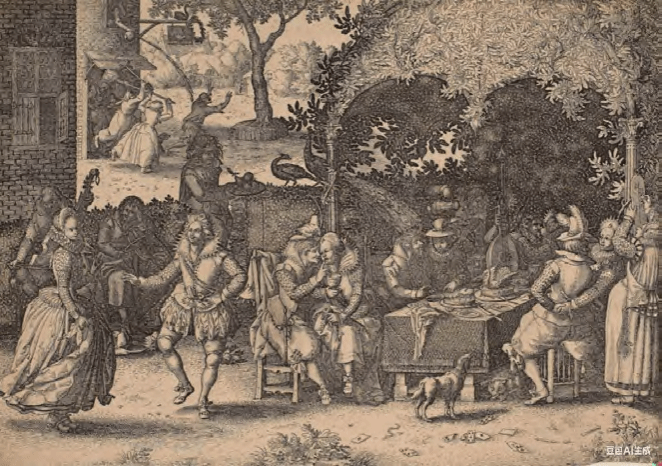 图 4,克拉斯·扬斯·维舍尔:《浪子回头组画之浪费遗产》,铜版,1608年