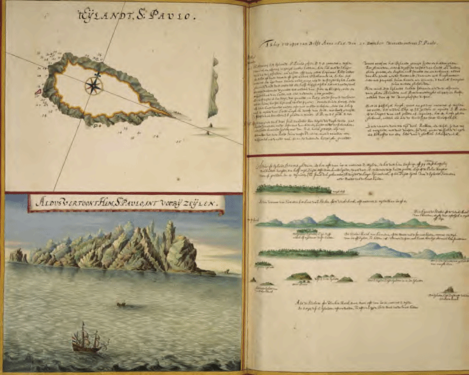 亲赴航海一线的制图师往往需要在旅途之中进行测绘和记录,这些翔实的资料非常珍贵。而这些内容需要在船只返航之时不断地进行修正,由布劳及其他测绘师在位于阿姆斯特丹的公司总部进行数据统计,以便不断调整,对航线的准确性提升迅速。1626 年 12 月 25 日,荷兰画家与制图师约翰尼斯·芬布恩斯(Johannes Vingboons,1616—1670)的实测记录可以使我们了解荷兰制图师是怎样进行工作。这些图谱之中显示出非常生动的制图师实绘海图(图 6):例如左侧是海岸线,数字显示了海水的探测记录,是航行经过该岛时所看到的该岛的剖面图,其中包括荷兰船只和划船上岸的画面,这艘船也是 1628年 11 月曾到达过中国台湾和巴达维亚运输货物的 5 艘荷兰舰船之一 , 一共运载了 840担中国生丝和 332 担铜料。海图右侧是芬布恩斯记述船组人员目击事件的描述:1626年 12 月 25 日。我们看到了圣保罗岛,在我们东北偏东 7 英里处。温度适中,所以我被派去岛上坐船,看有没有好的路标和水源或其他东西。就这样,我在黎明前一个小时到达岛的西边,在 40 到 45 英寻的深度寻找离海岸大约步枪一半射程的距离,但除了岩石和悬崖什么也没有。西边山体十分陡峭,不管你怎么努力,都爬不上海滩。因为太晚不能行驶到东边,而且船在离海岸不少于 2 英里的地方漂浮,我们划了回来。第二天,船绕着岛转了一圈,在岛的另一边画了一张图,没有发现什么有趣的东西,没有好的着陆地点,但是也没有危险的悬崖和淹没的岩石,必须提醒未来的水手,除了一些矮树丛之外,他们没有发现树木或植被,在报告的最后,作者提到他们捕获了大量的鱼和海豹,足以养活船上的船员。[12]